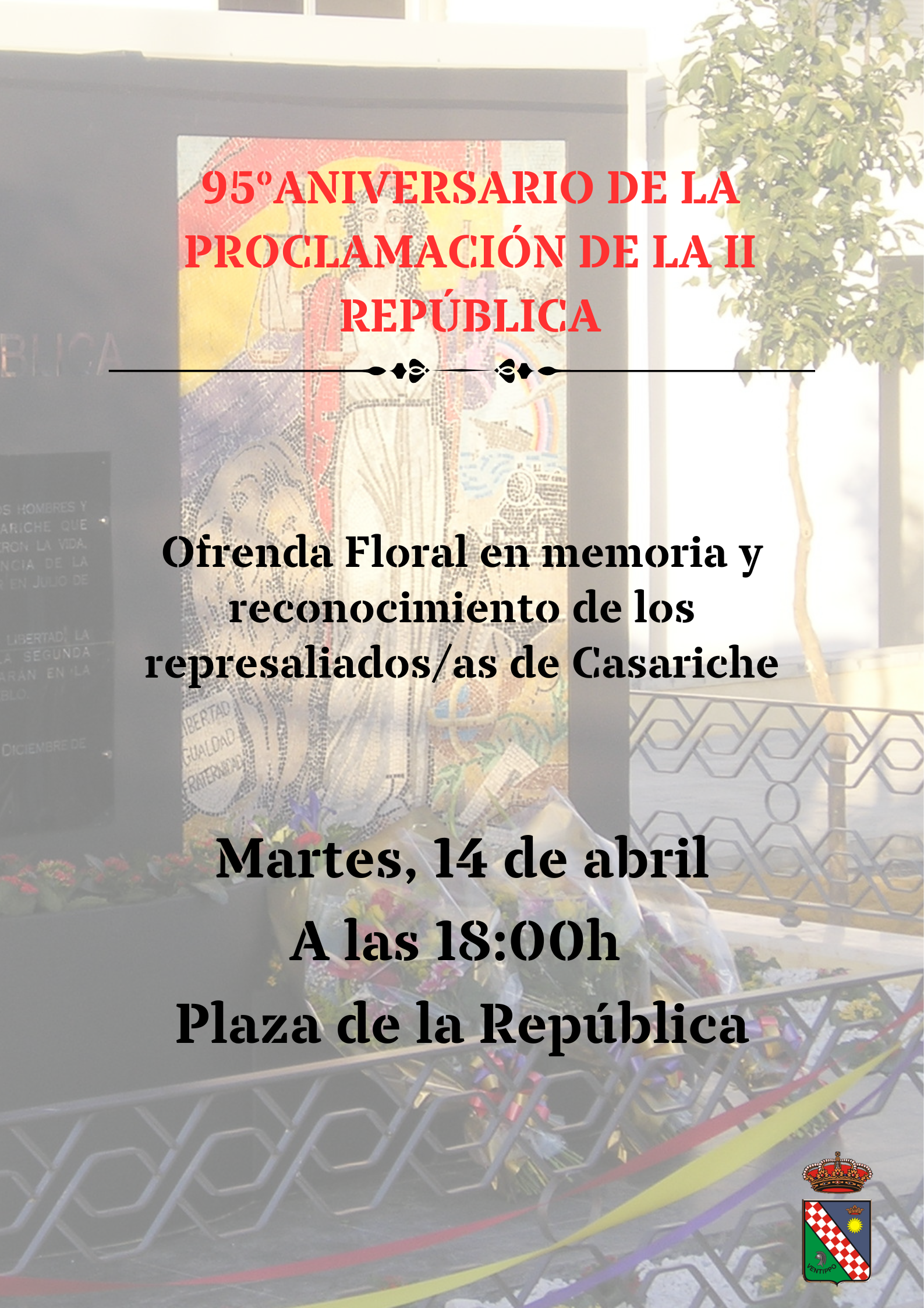 Desde el Ayuntamiento invitamos a todos los vecinos y vecinas a participar en el acto conmemorativo que se celebrará mañana con motivo del 95 aniversario de la proclamación de la II República.