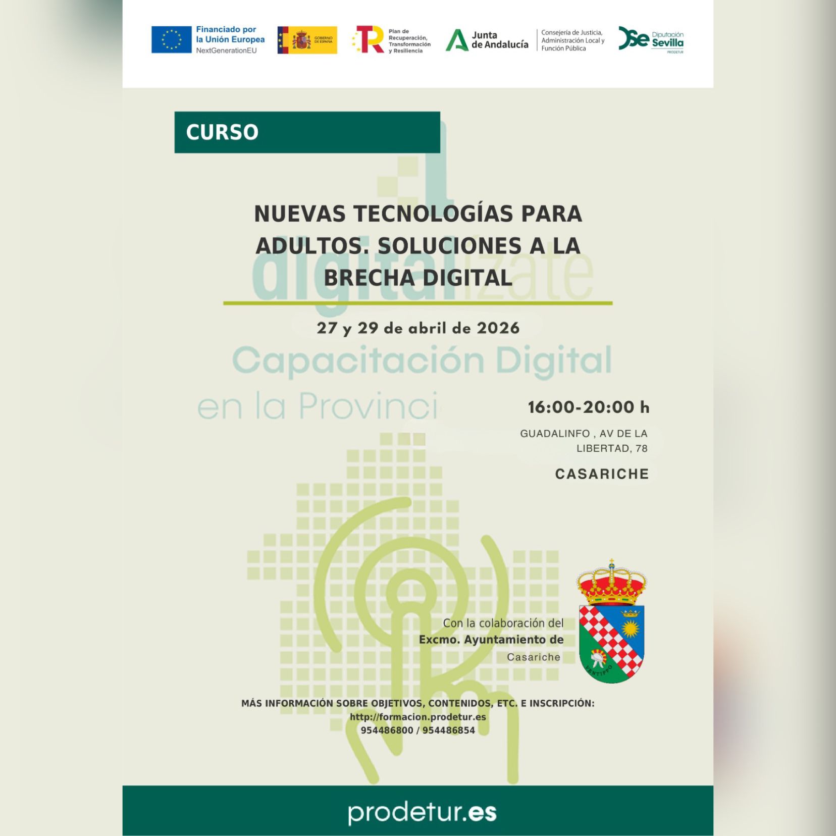Dicha acción formativa está financiada por la Unión Europea a través de los fondos NextGenerationEU, en colaboración con el Gobierno de España, la Junta de Andalucía y la Diputación de Sevilla, y cuenta con la colaboración del Ayuntamiento de Casariche.