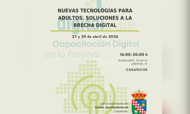 El Ayuntamiento de Casariche informa de la celebración de un nuevo curso “Nuevas tecnologías para adultos. Soluciones a la brecha digital”, una iniciativa formativa dirigida a mejorar las competencias digitales de la población adulta del municipio.