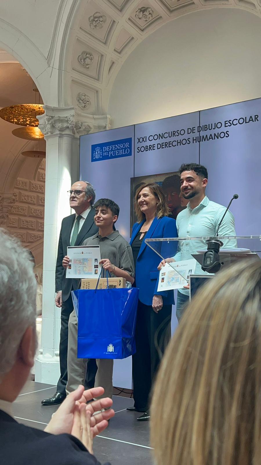 La entrega de premios tuvo lugar el pasado miércoles 22 de abril en Madrid, en la sede de esta institución, en un acto presidido por el Defensor del Pueblo, Ángel Gabilondo. Hasta allí se desplazó el alumno, acompañado por nuestro Concejal de Cultura y profesor del IES Atalaya, Juan José Pozo Escalera, y su familia.