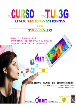 Si quieres sacar el máximo partido a tu móvil 3G, no dudes en inscribirte en el Curso «Tu 3G, una herramienta de trabajo», que se celebrará el próximo 25 de Febrero, de 10:30 h a 12:30 h, en la Casa de la Juventud, a cargo de Aroa Carnerero.