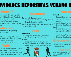 Leer másLa Delegación de Deportes de nuestro Ayuntamiento abre hoy el plazo de inscripción en las Actividades Deportivas del Verano 2024 (fútbol-7 y fútbol sala, baloncesto,
