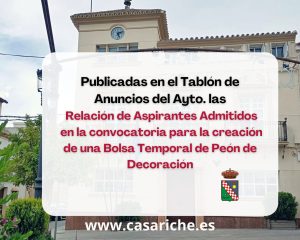 Desde el Área de Empleo, informamos que ya se puede consultar en el Tablón de Anuncios del Ayuntamiento la Relación Definitiva de Aspirantes a la