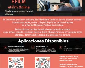Nuestra Biblioteca Municipal ha incorporado un nuevo servicio denominado eFilm Andalucía, que consiste en el préstamo de audiovisuales. Se trata de una plataforma digital que ofrece acceso