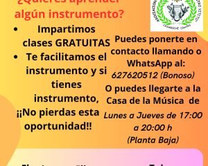 La Asociación Cultural Musical Maestro Vitito de Casariche imparte clases gratuitas para aprender a tocar alguno de los siguientes instrumentos: flauta, clarinete, saxofón, trompeta, fliscorno,