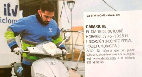 Leer másLa ITV móvil de ciclomotores se encontrará en Casariche (Recinto Ferial – Caseta Municipal) el día 18 de Octubre de 09:45 a 13:15 horas. Teléfono