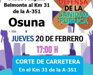 Marea Blanca ha convocado una manifestación en defensa de la Sanidad Pública que se llevará a cabo este jueves 20 de febrero en Osuna. Se