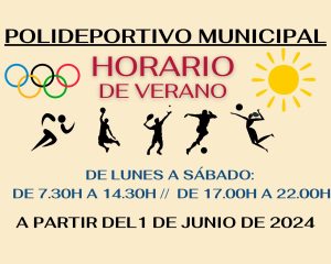 Leer másLa Delegación de Deportes de nuestro Ayuntamiento informa que el horario de apertura del Polideportivo Municipal durante la Semana Santa 2024 será de 08:00h a